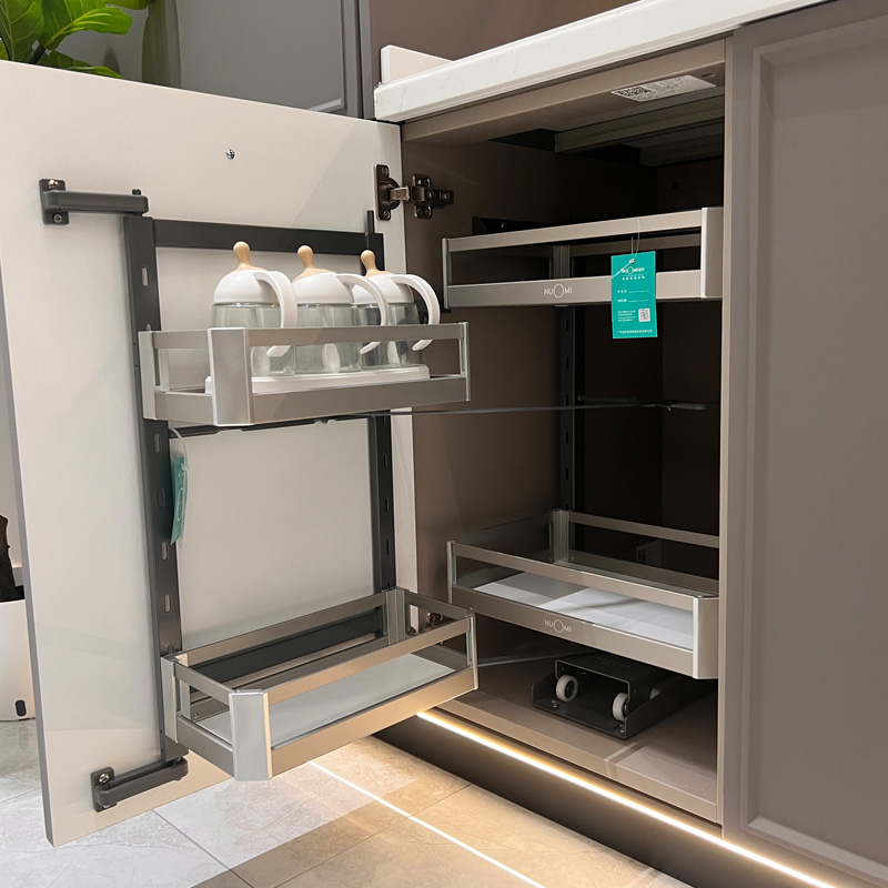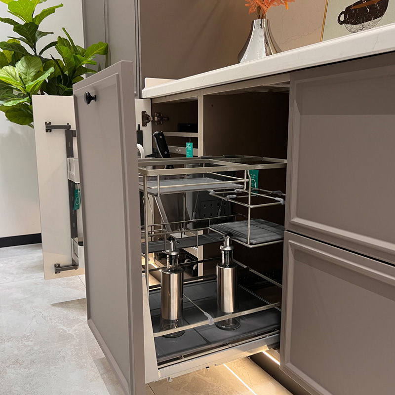 O hardware funcional pode ser escolhido de acordo com seus costumes e estilo de vida. O espaço de armazenamento pode ser grande com as ferragens funcionais adequadas, deixe sua cozinha sempre limpa e arrumada.