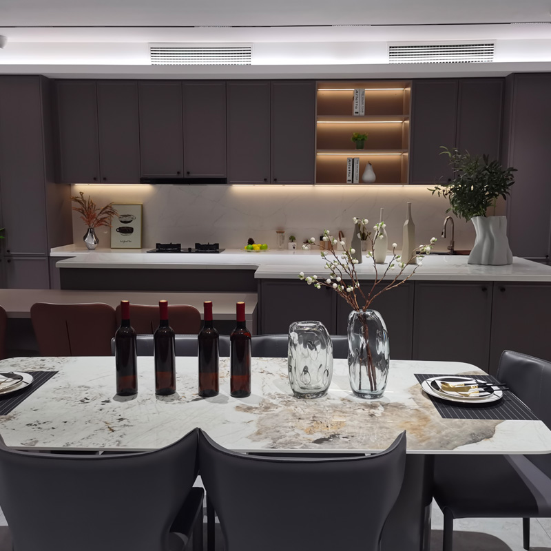 Armário de cozinha clássico de cor marrom fosco com design de painel de porta em forma, parece pele quando tocado. Manutenção fácil e pode ser combinado com várias decorações de casa.