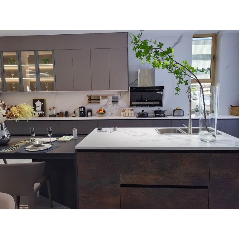 A parte superior do gabinete fica próxima ao teto, o que amplia o espaço de armazenamento e reduz o acúmulo de poeira. Você pode colocar chá, café, vinho, copos e outras coisas comuns nas prateleiras ou nos armários. Será bastante fácil e conveniente de acessar. Seus brinquedos, artesanato, fotos e kits de garagem também podem ser colocados para exibição.