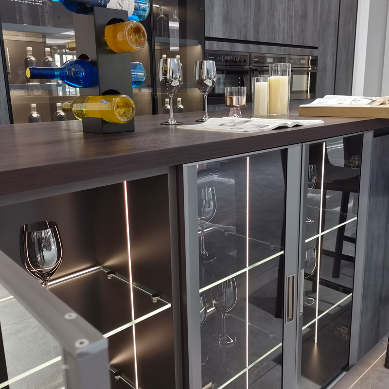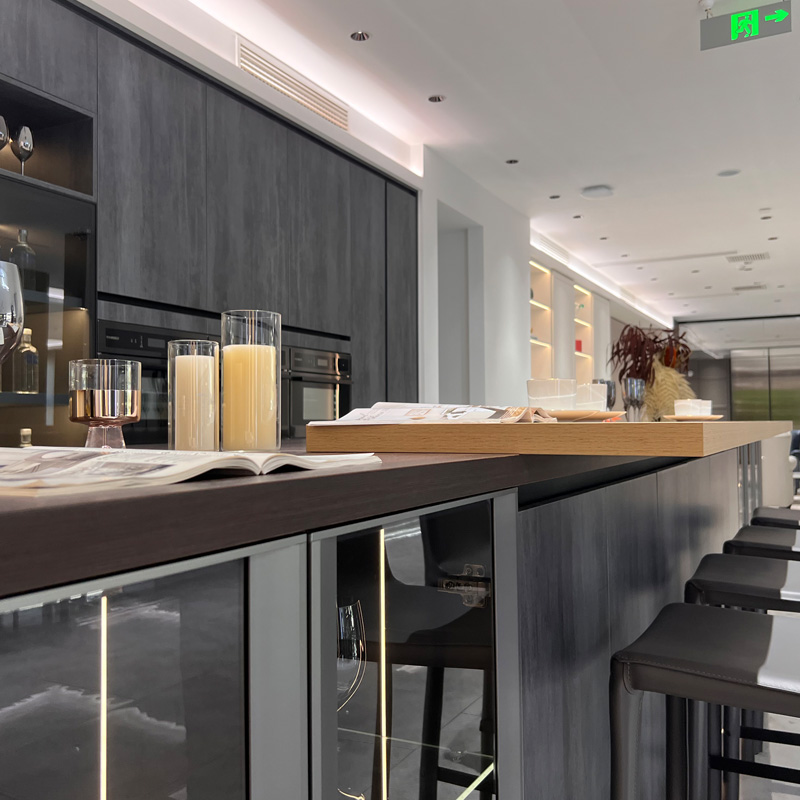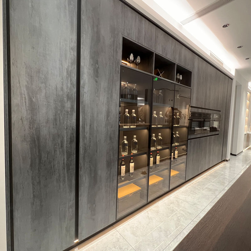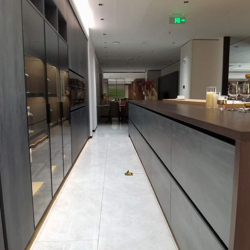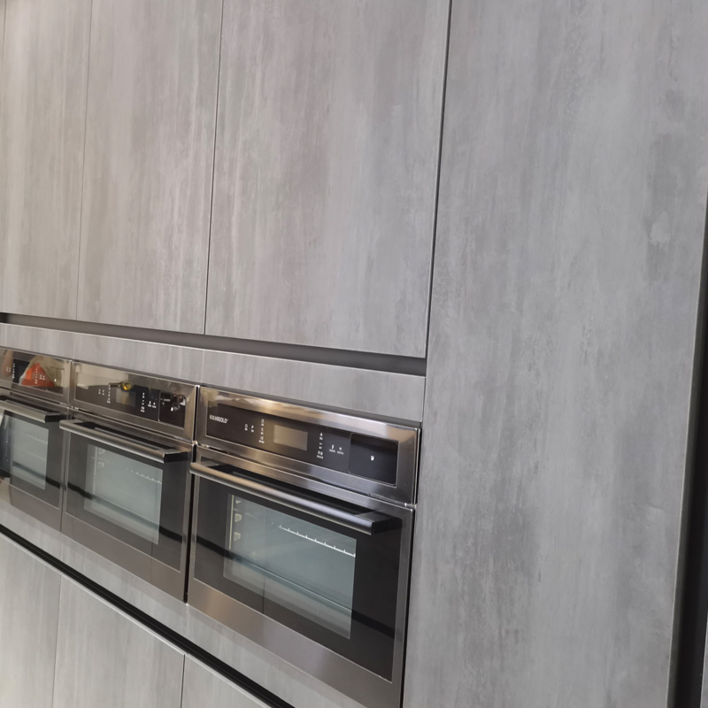 Armário de cozinha laminado industrial de estilo novo com tratamento antigo de cor como o desgaste da rocha, a sensação de toque é suave e de qualidade, painel de porta de vidro combinando com moldura de alumínio, cria o efeito de decoração de alta sensação da cozinha. O material é impermeável, fácil de limpar e o estilo não é fácil de sair.