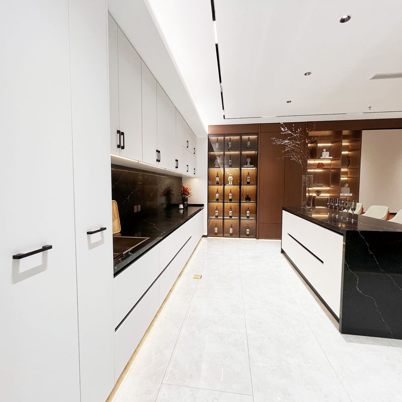 R: Painel de porta sem puxador para armários de cozinha é muito moderno e de fácil manutenção. Ou escolha a alça de aço inoxidável é muito adequada para cozinha.