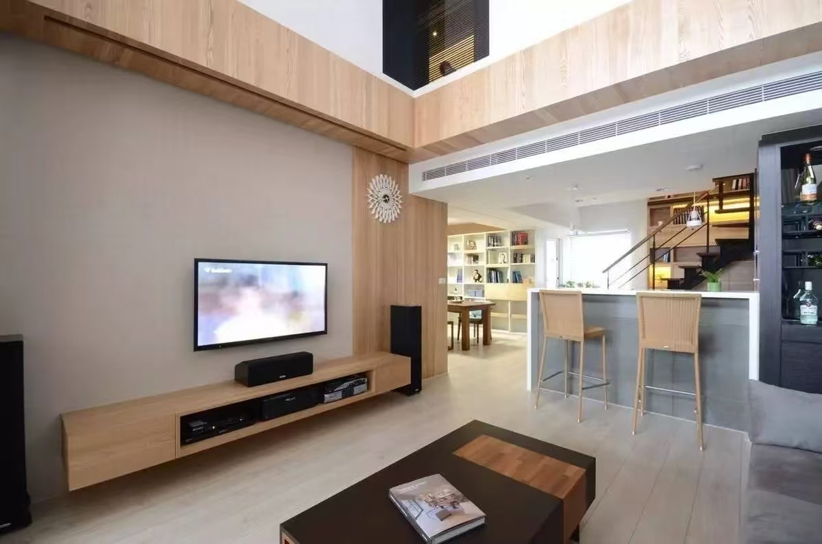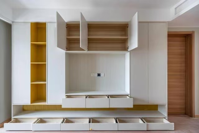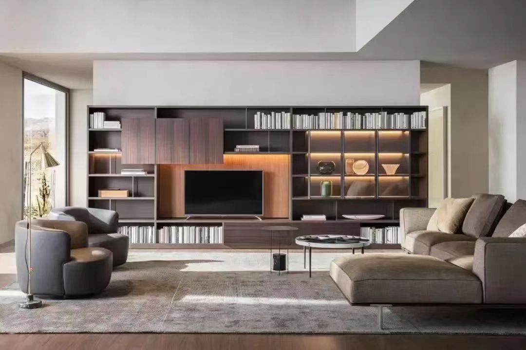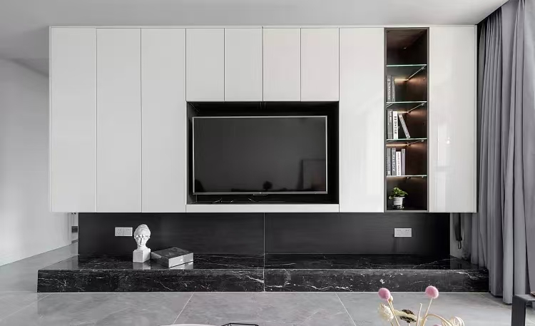 Com o gabinete de TV como centro, a área circundante pode ser projetada como uma estante ou armário de armazenamento. Se a área for grande o suficiente, você pode adicionar um armário de vinho, criando um design integrado que aprimora a coordenação e a riqueza.