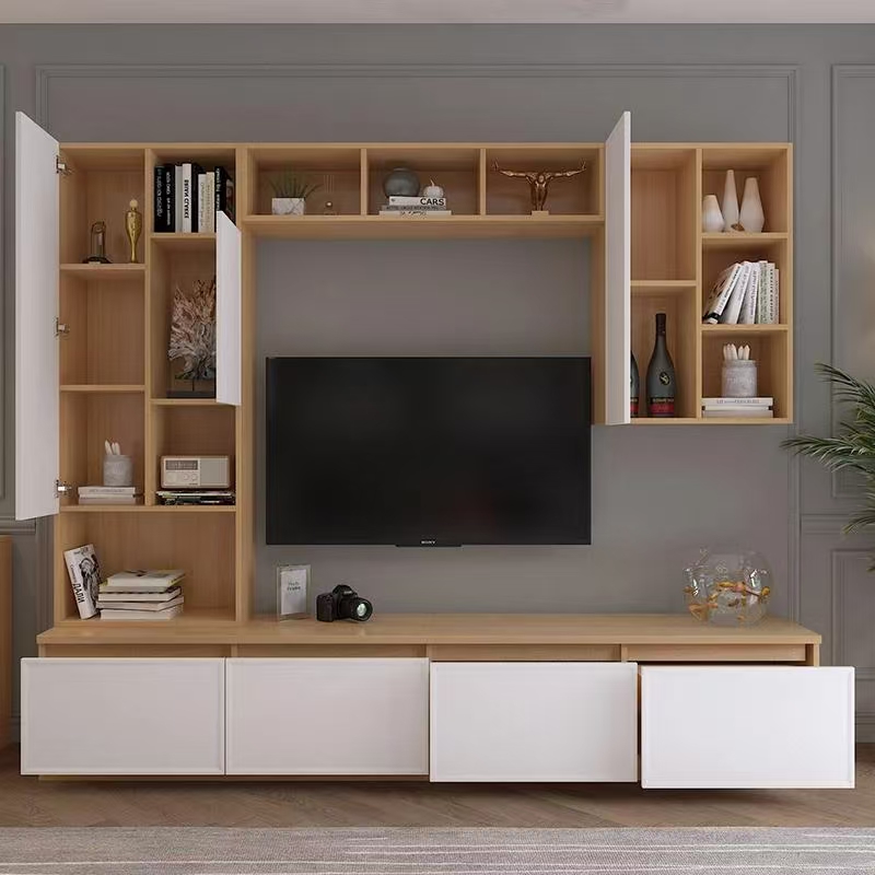 Comparado aos dois primeiros tipos de armários de TV, o gabinete de TV integrado tem espaço de armazenamento nos quatro lados, maximizando a capacidade de armazenamento. É especialmente recomendado para famílias com um grande número de membros e necessidades significativas de armazenamento.