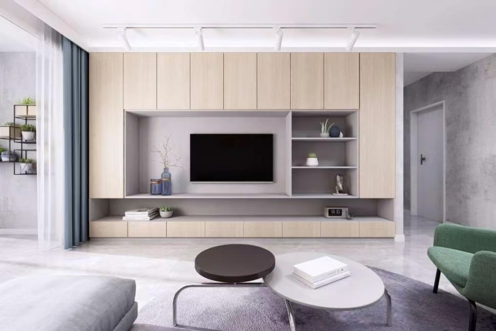 Você também pode usar a televisão como peça central e combiná-la com armários montados na parede, armários de piso e armários de armazenamento para criar um design mais em camadas e prático.
