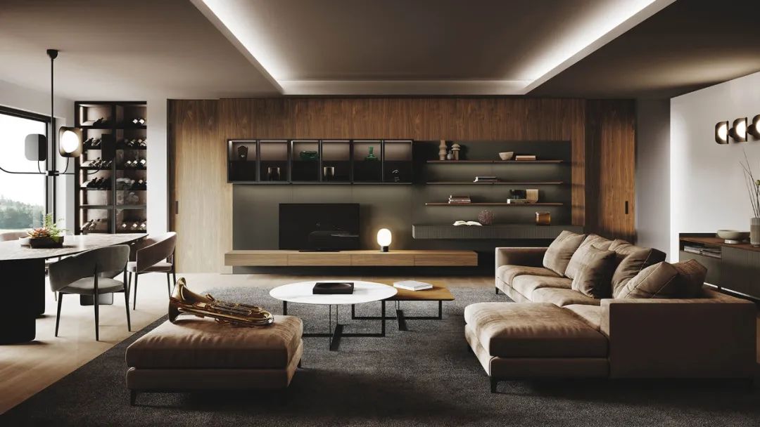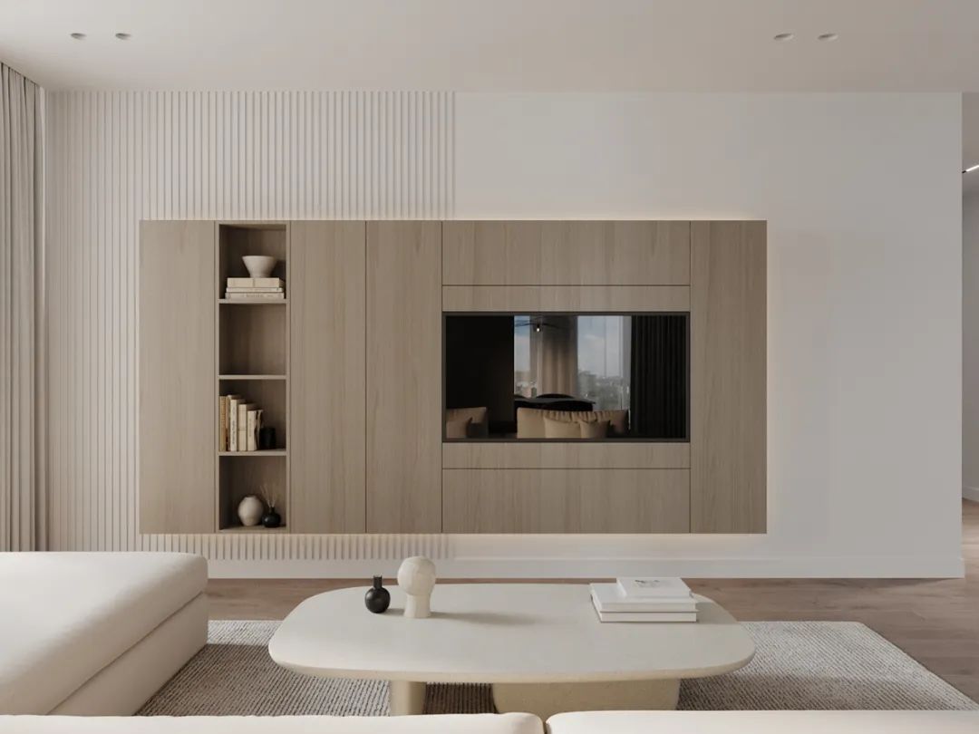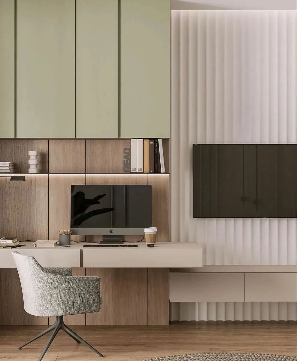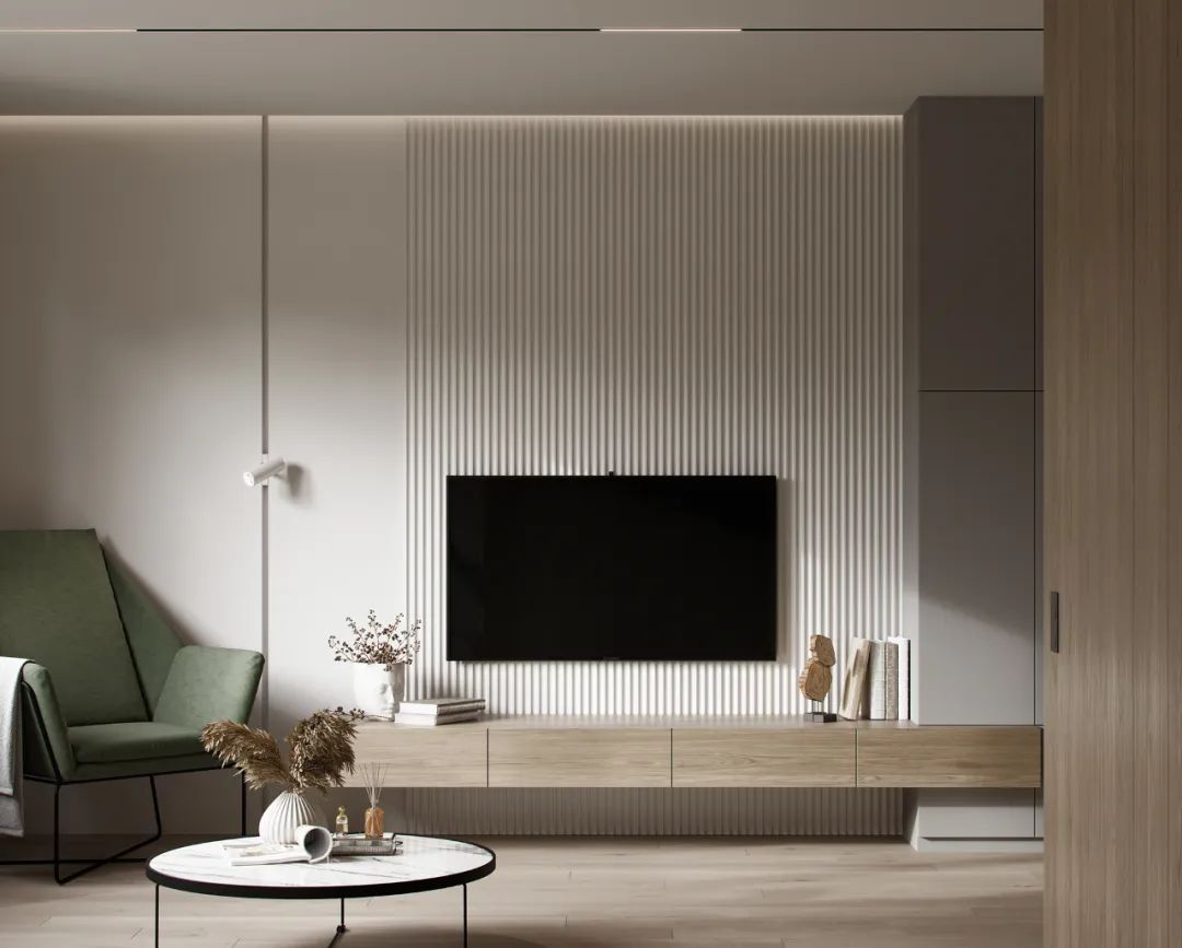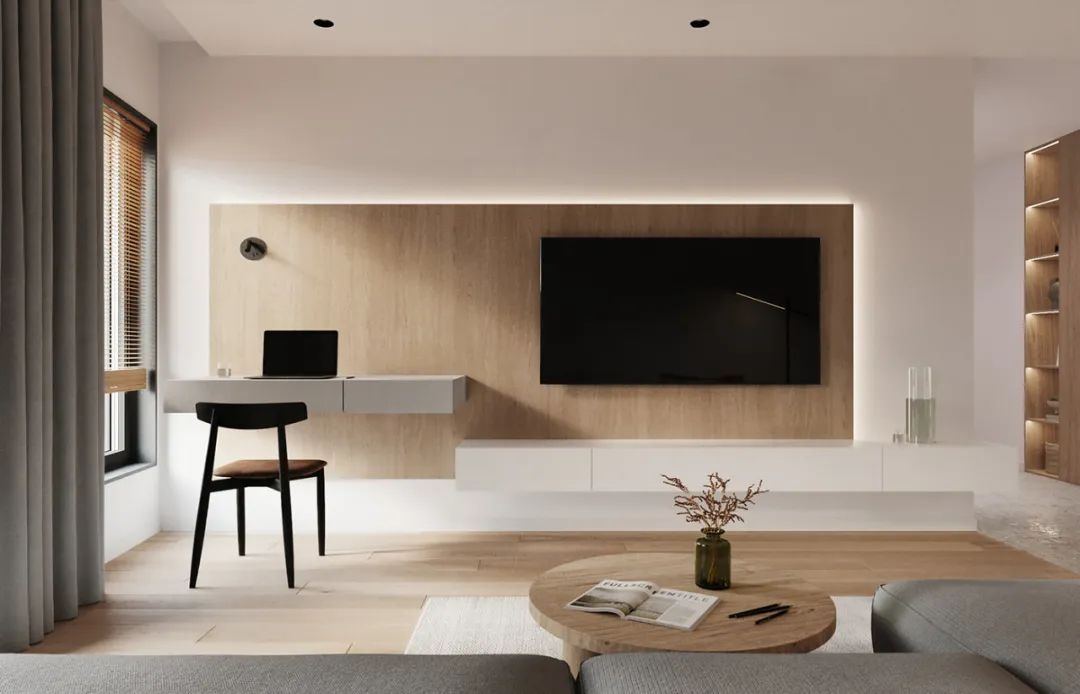 O design suspenso não se limita a armários. Uma parede de TV suspensa que serve como divisor espacial é uma escolha popular nos dias de hoje, acrescentando um toque de elegância à casa.