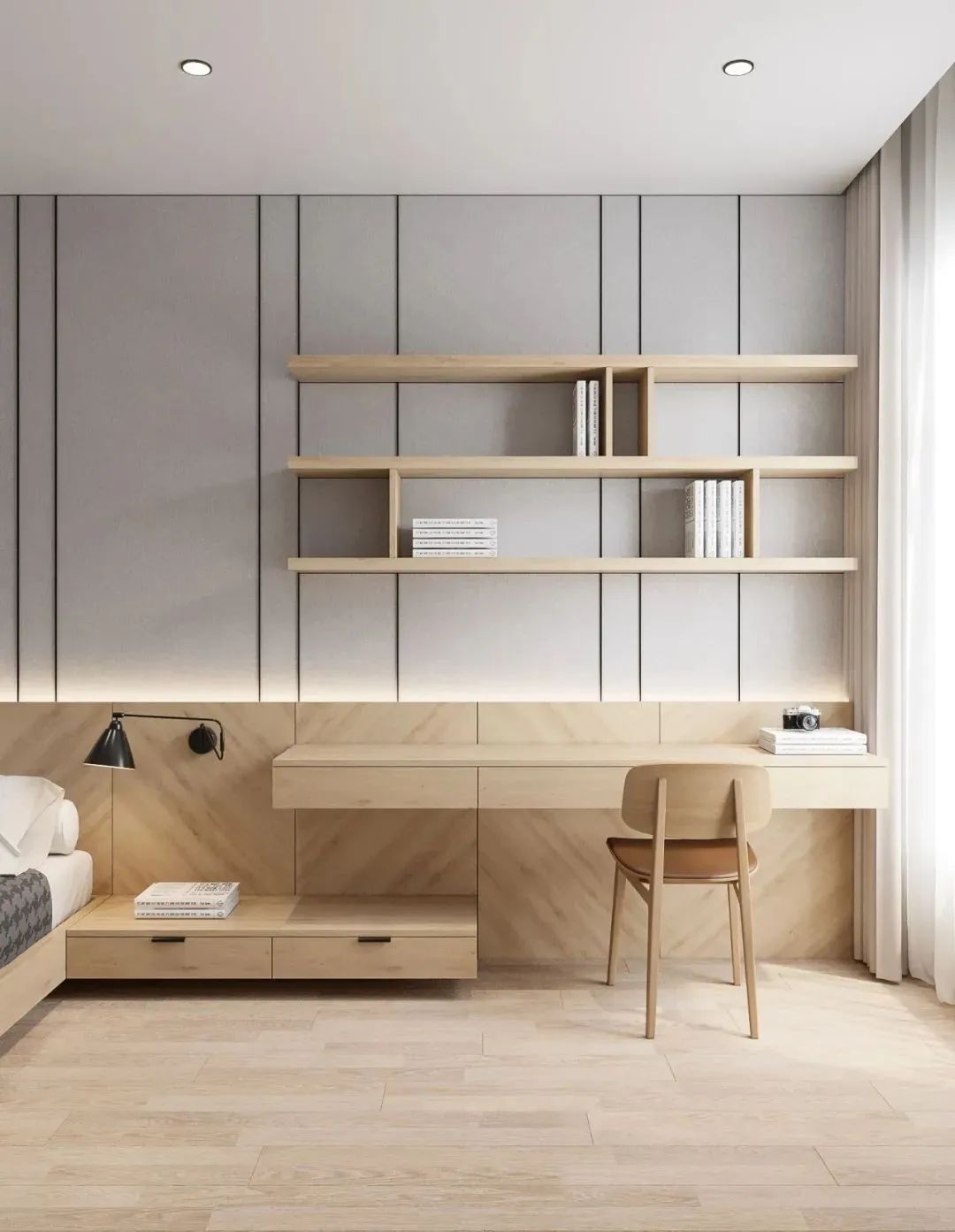 As mesas tradicionais de cabeceira ocupam uma grande quantidade de espaço e carecem de personalização e senso de moda. A suspender a mesa de cabeceira na parede e personalizá -la integralmente com a parede de fundo cria uma aparência 整齐划一 e sofisticada.