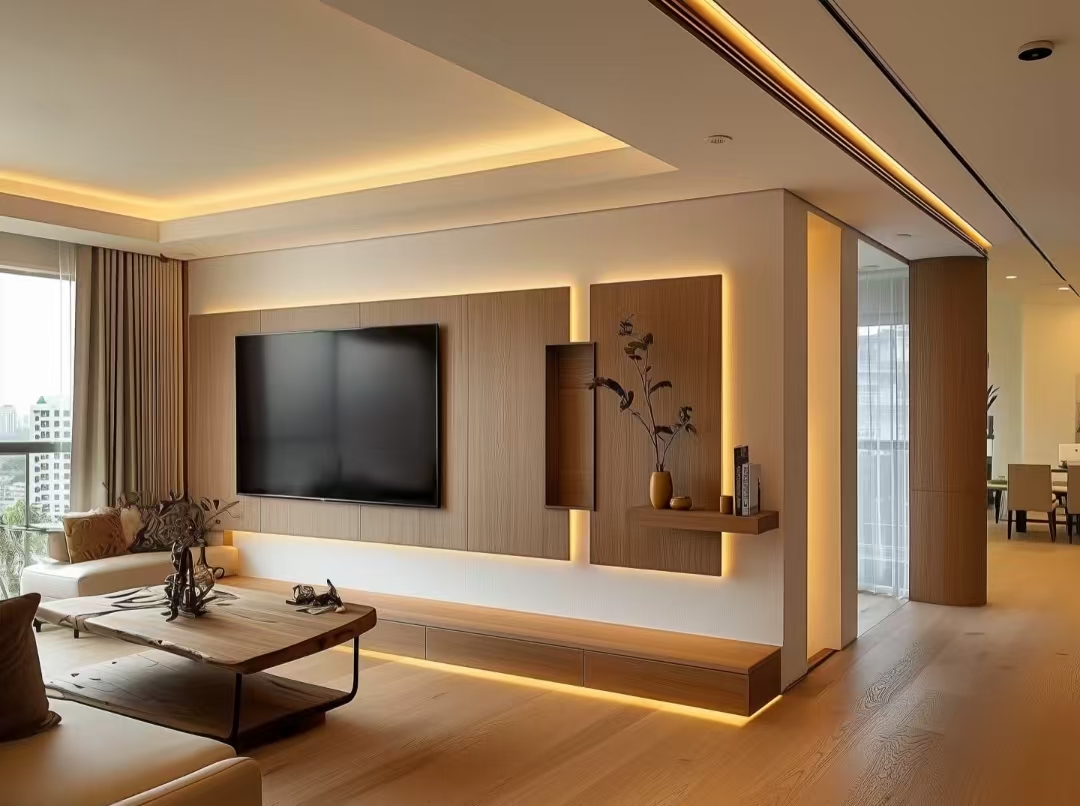 Parede minimalista da TV com formas geométricas limpas e nítidas.