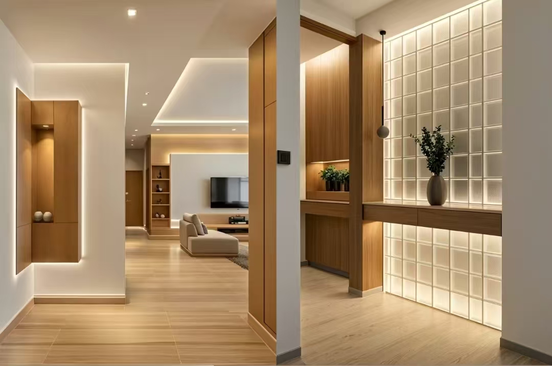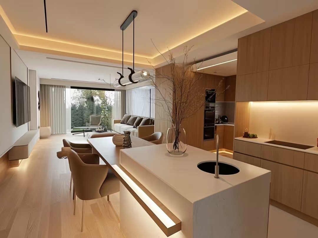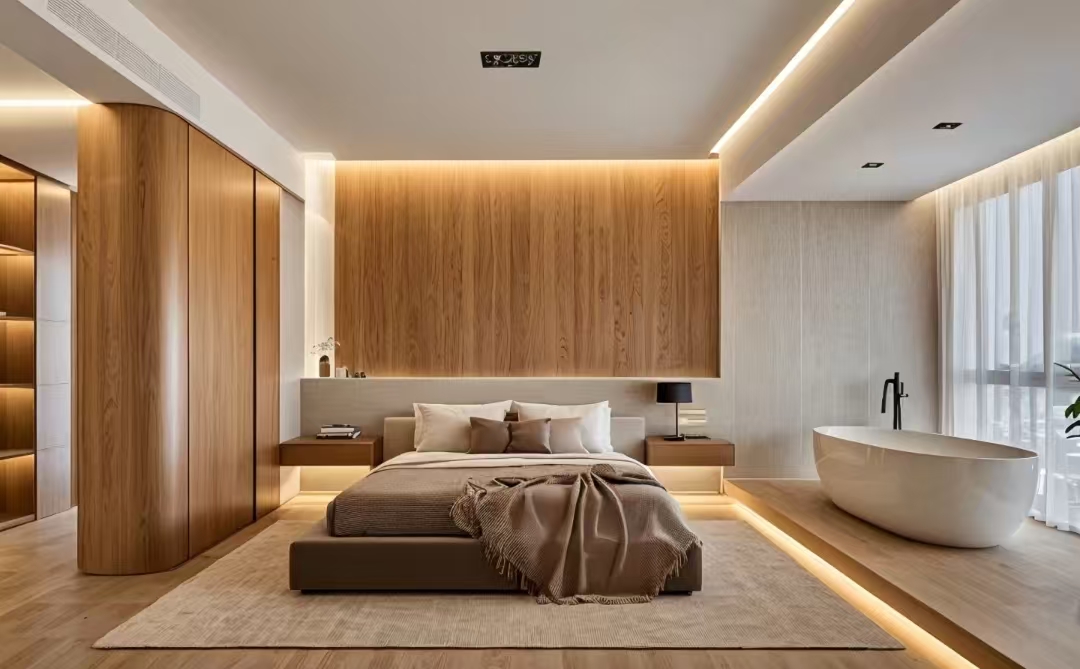 Os acabamentos de madeira fornecem um toque suave, misturando tons quentes e frios.