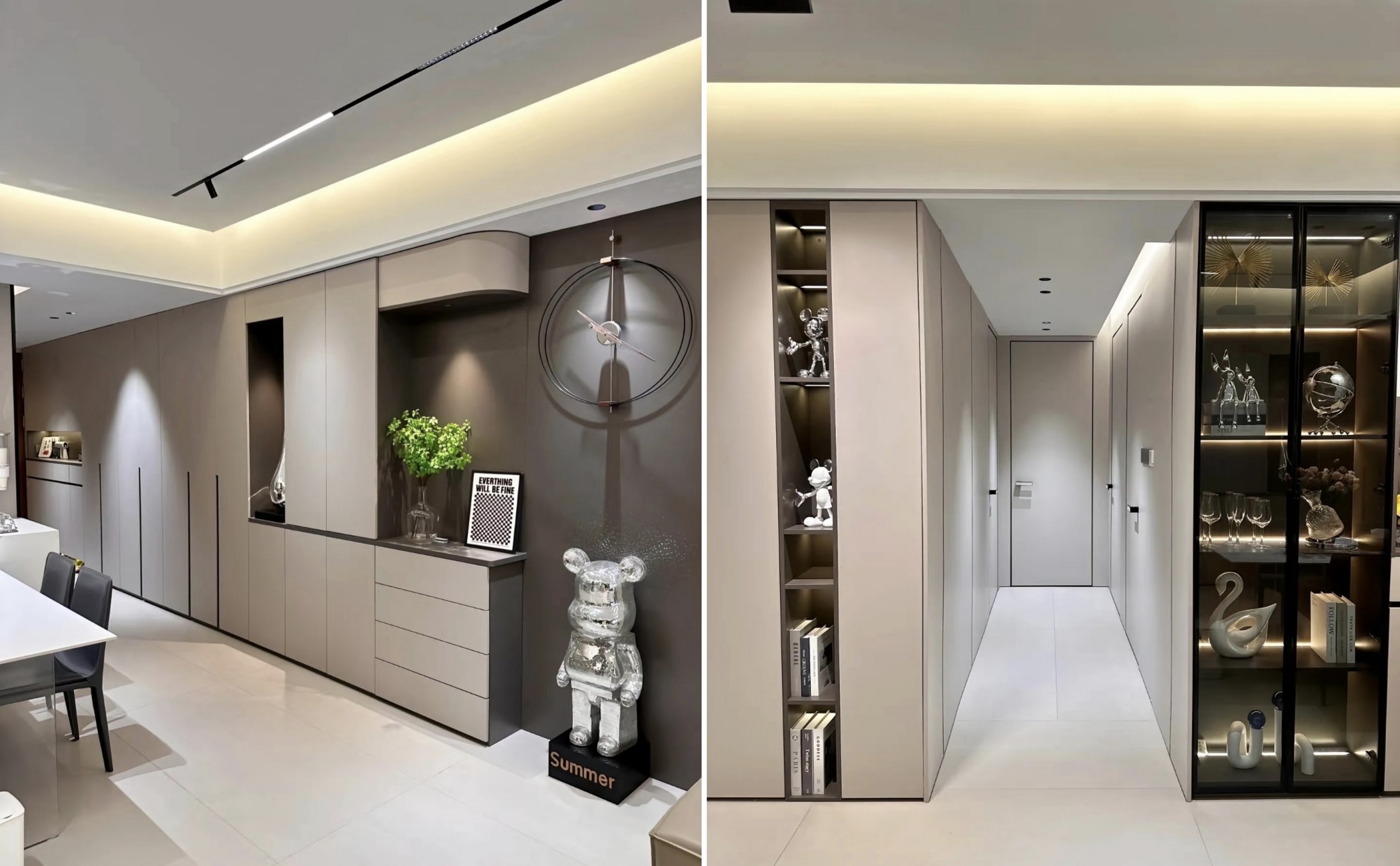 1. A casa inteira é pavimentada com 1500*750 ladrilhos foscos cinza quentes, usando a mesma cor da areia de cor epóxi, sem pedras limiares, tornando o espaço mais transparente.